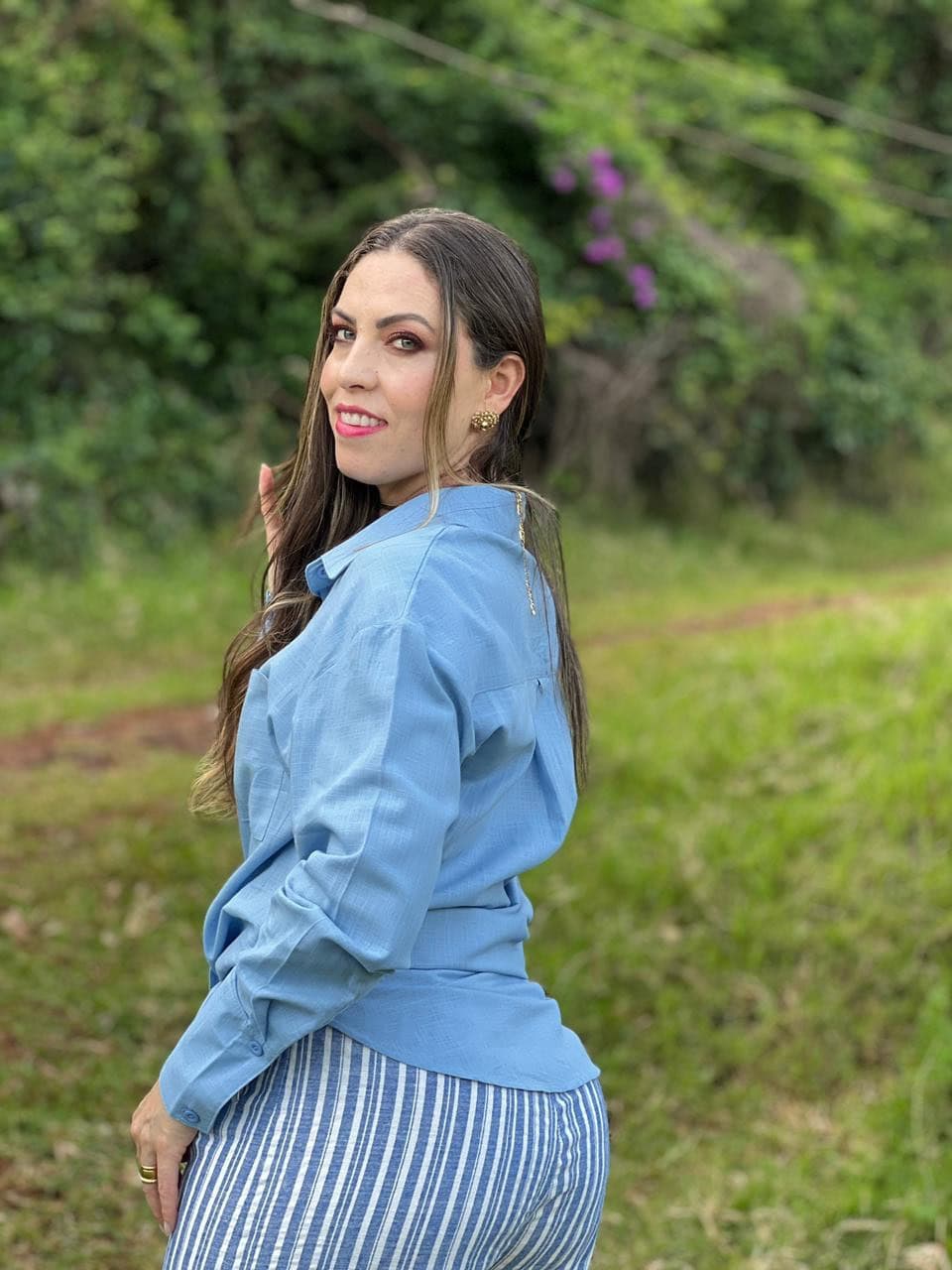 Possui modelagem clássica e levemente solta, que valoriza a silhueta sem marcar, oferecendo um caimento elegante e confortável. O fechamento frontal por botões traz praticidade e charme atemporal, enquanto a gola tradicional adiciona um ar refinado à peça. As mangas longas com punhos ajustáveis permitem diferentes formas de uso, podendo ser usadas dobradas para um visual mais casual.