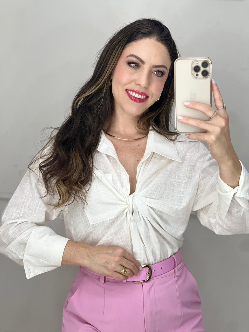 A tonalidade suave e sofisticada facilita combinações, transitando com facilidade entre produções casuais, urbanas ou mais elegantes. Fica perfeita com calças de alfaiataria, jeans, saias ou shorts, além de poder ser usada tanto solta quanto por dentro da peça, criando diferentes propostas de look.