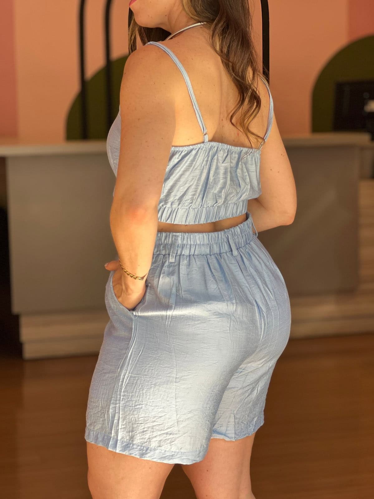 ESSE CONJUNTO EM TECIDO ACETINADO AZUL-CLARO É DAQUELAS PEÇAS QUE CONQUISTAM À PRIMEIRA VISTA. O CAIMENTO LEVE E O BRILHO SUAVE CRIAM UM VISUAL ELEGANTE SEM ESFORÇO — PERFEITO PARA QUEM QUER ESTAR CONFORTÁVEL, MODERNA E IMPECÁVEL AO MESMO TEMPO.