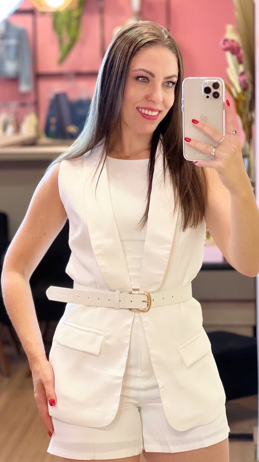 Esse conjunto em alfaiataria no tom rosa é a definição de elegância moderna com um toque fashionista. O colete alongado com lapela traz sofisticação e estrutura ao visual, enquanto o short de cintura alta com cinto do mesmo tom garante charme e realce à silhueta.