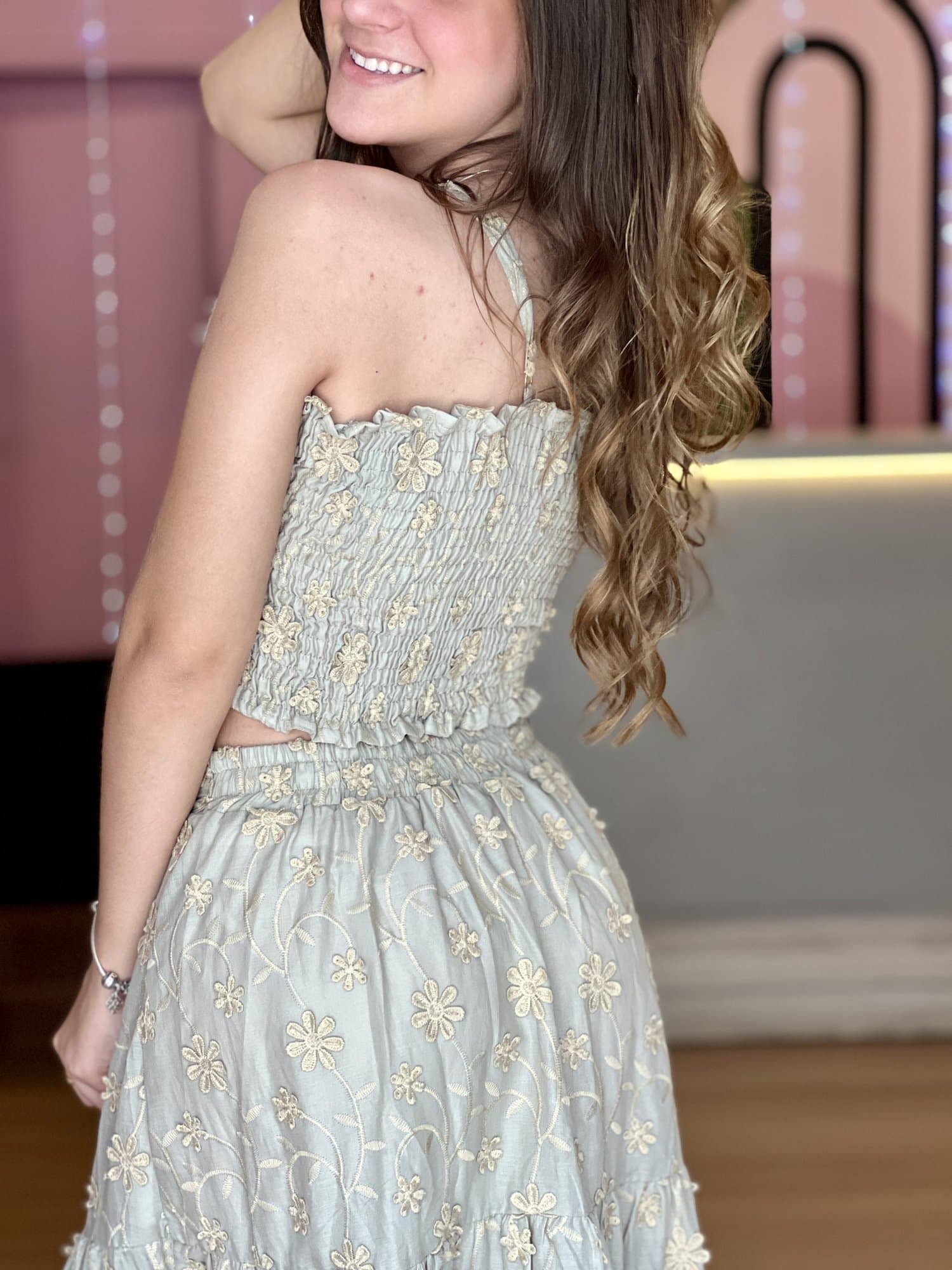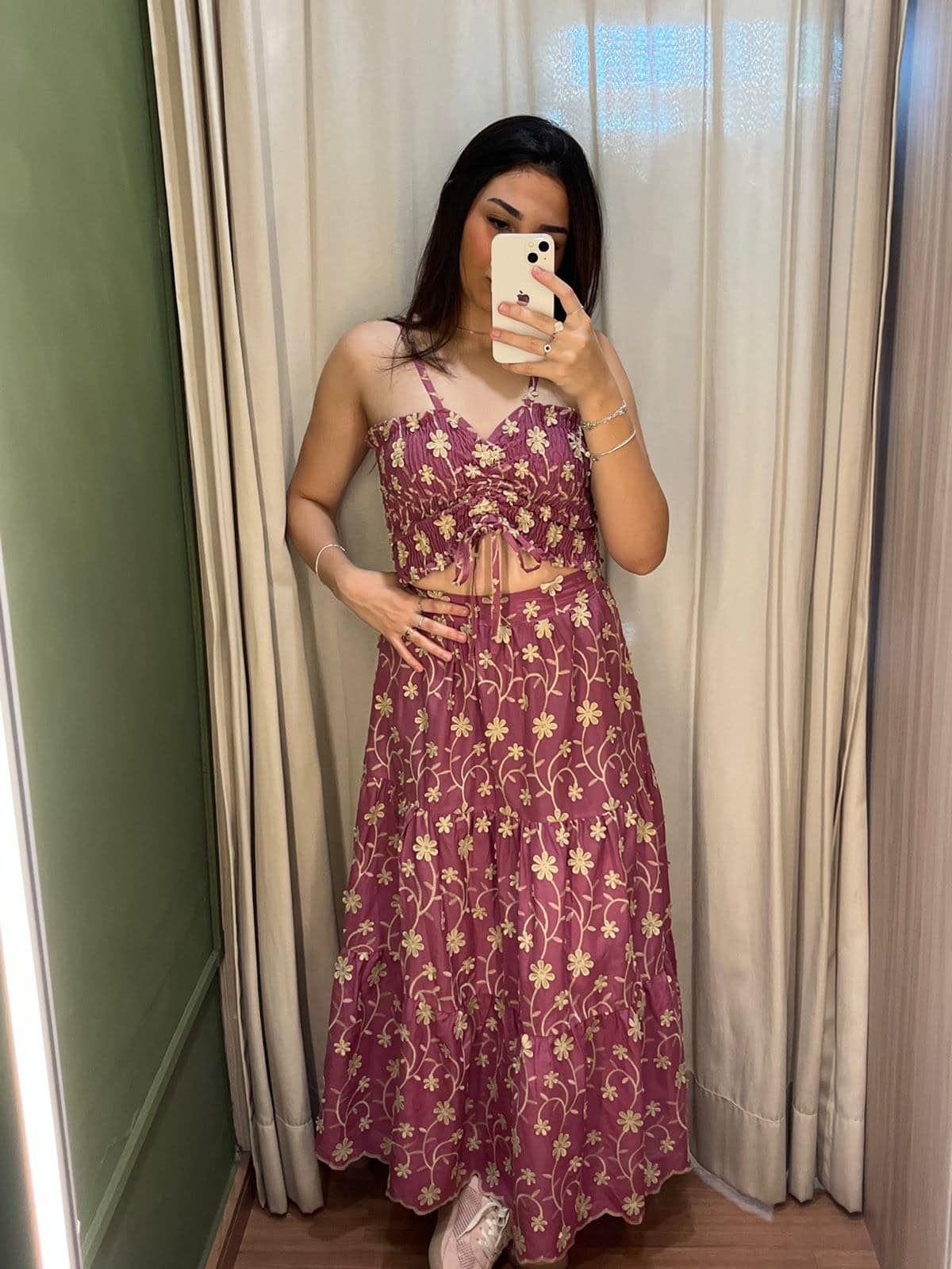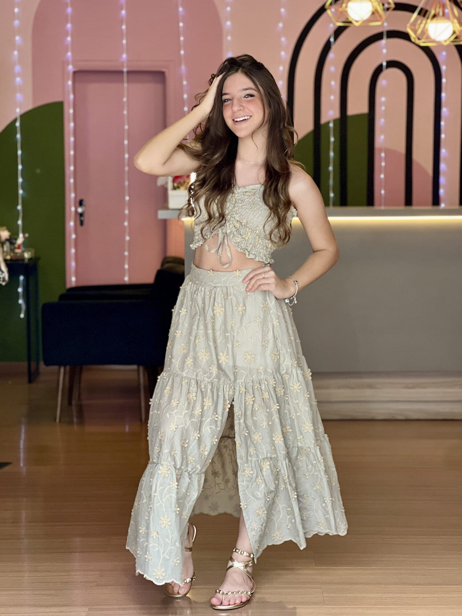 O Conjunto Lara é a escolha perfeita para quem busca um look moderno, diferenciado e com caimento impecável. A saia possui aplicações de bordado no lese que trazem um toque fashion e sofisticado à peça, além de ter fenda lateral, que valoriza o visual e traz movimento. Na parte de trás, o acabamento é pensado para vestir super bem, garantindo charme e conforto.