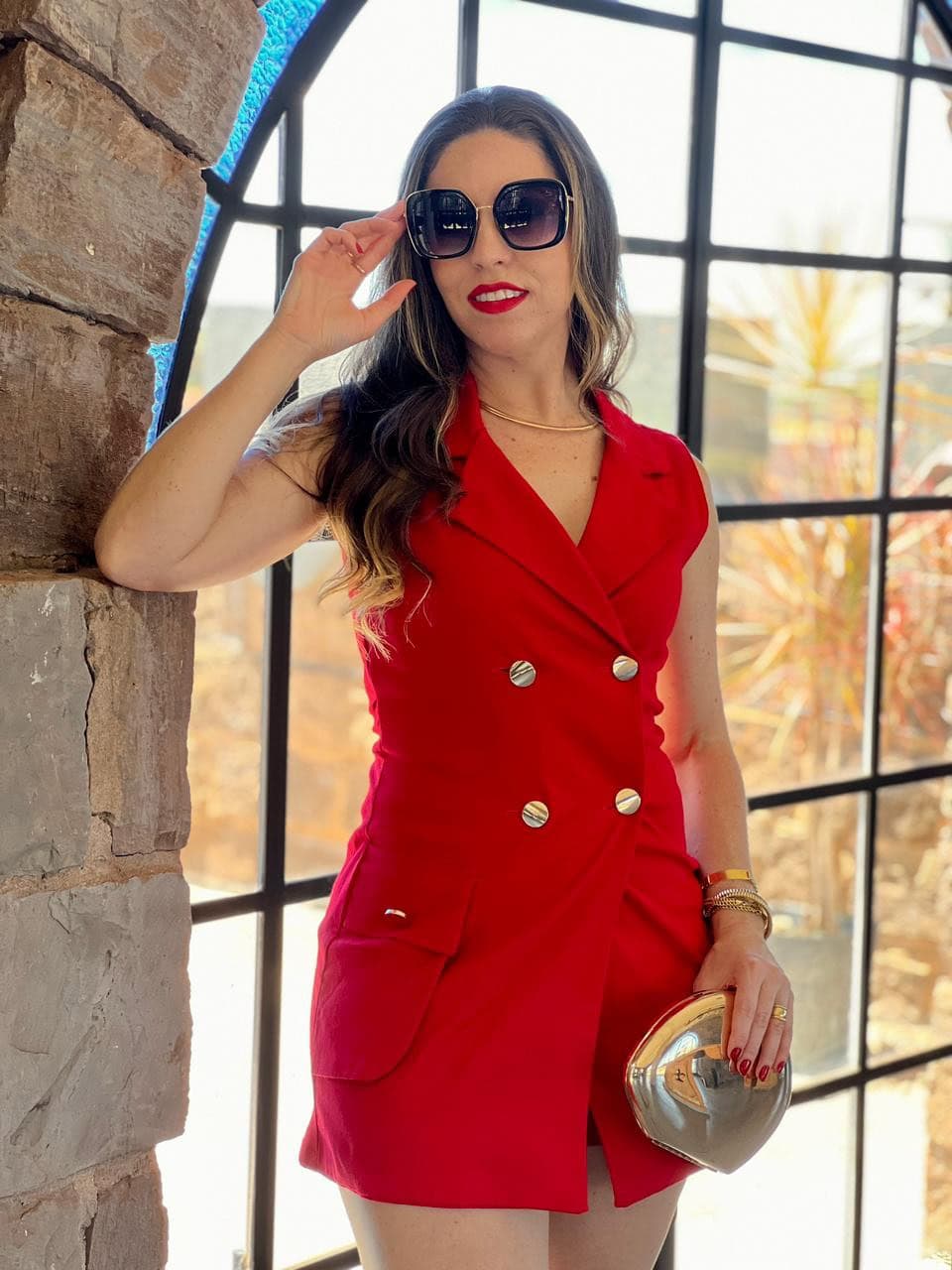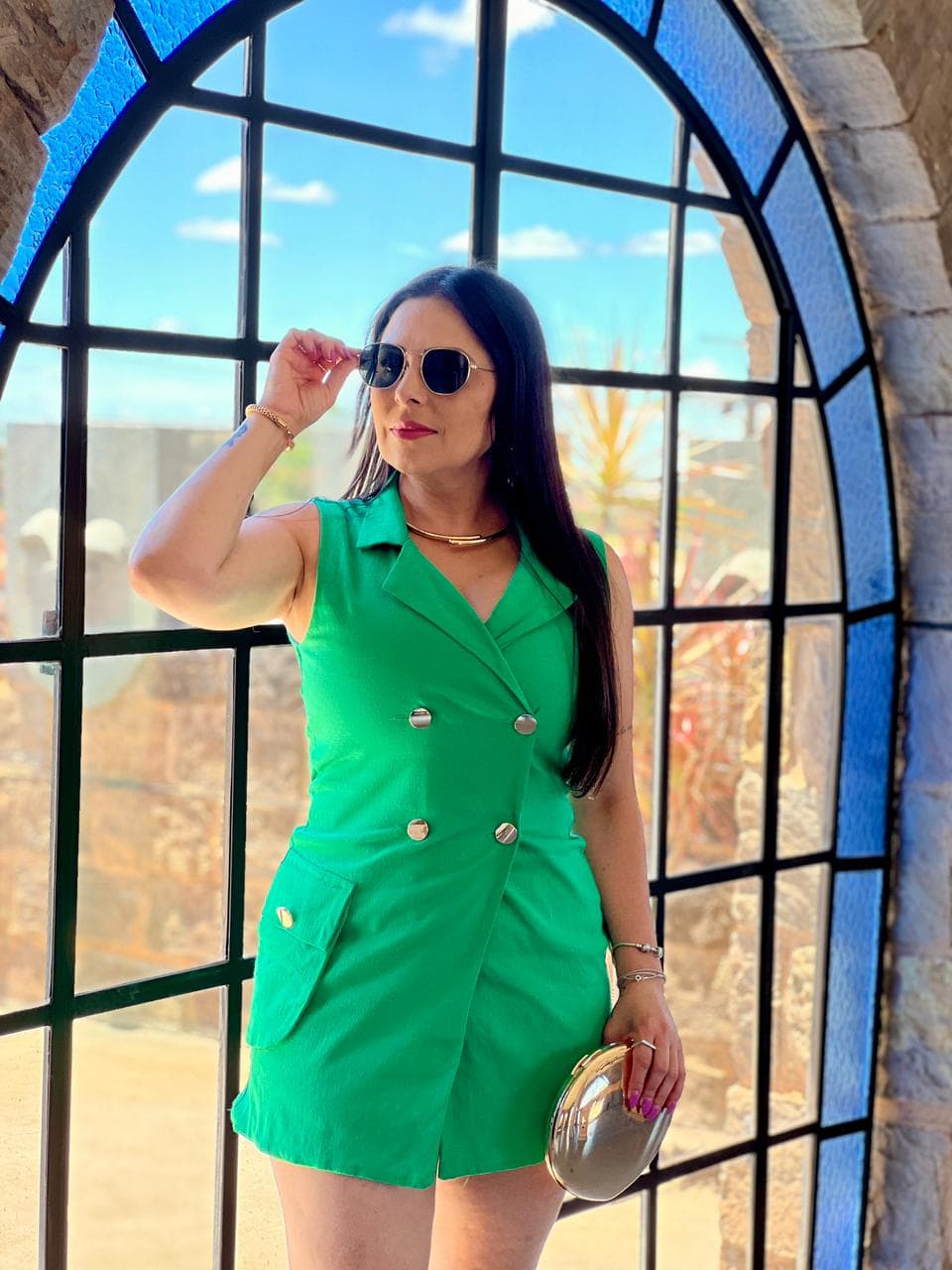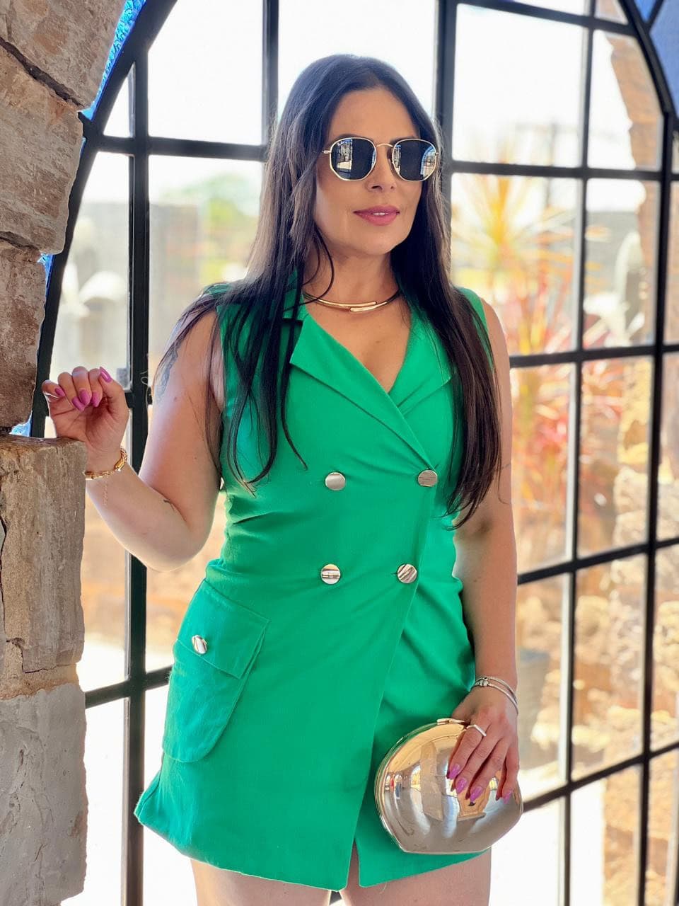 Estilo e Design: A peça possui um design elegante e moderno, inspirado na alfaiataria, com lapelas frontais e botões decorativos grandes em tom prateado. O modelo é curto e sem mangas, ideal para climas mais quentes ou eventos sociais.