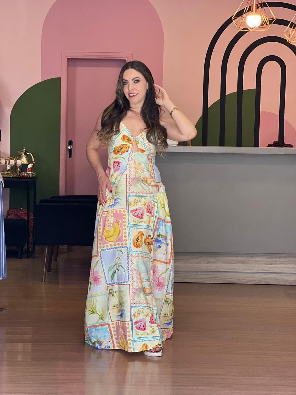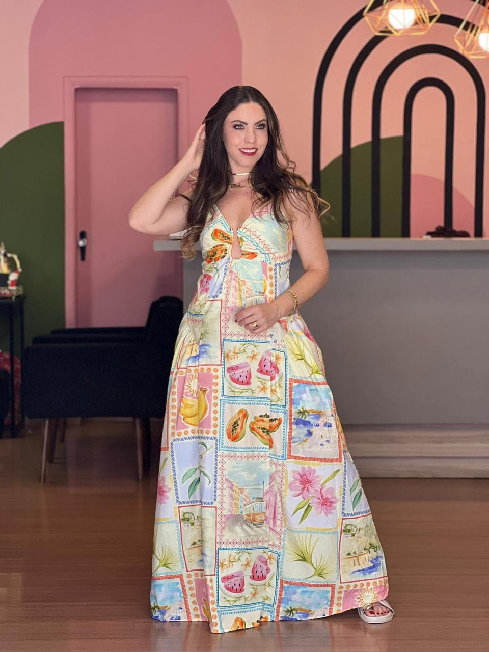 Um vestido com estamparia maravilhosa, mesclando tons de rosa e colorido que destacam a peça de forma delicada e elegante. Na região do busto, o detalhe dourado traz um toque sofisticado e moderno.Nas costas, o acabamento em látex proporciona melhor ajuste ao corpo, valorizando a silhueta com um caimento leve e fluido que não marca e oferece conforto o dia todo.É uma peça extremamente versátil: pode ser usada tanto no dia a dia quanto em ocasiões como jantares, aniversários, encontros, eventos ao ar livre ou até mesmo em viagens sempre entregando estilo sem esforço.Tamanho único, vestindo tranquilamente até o G.