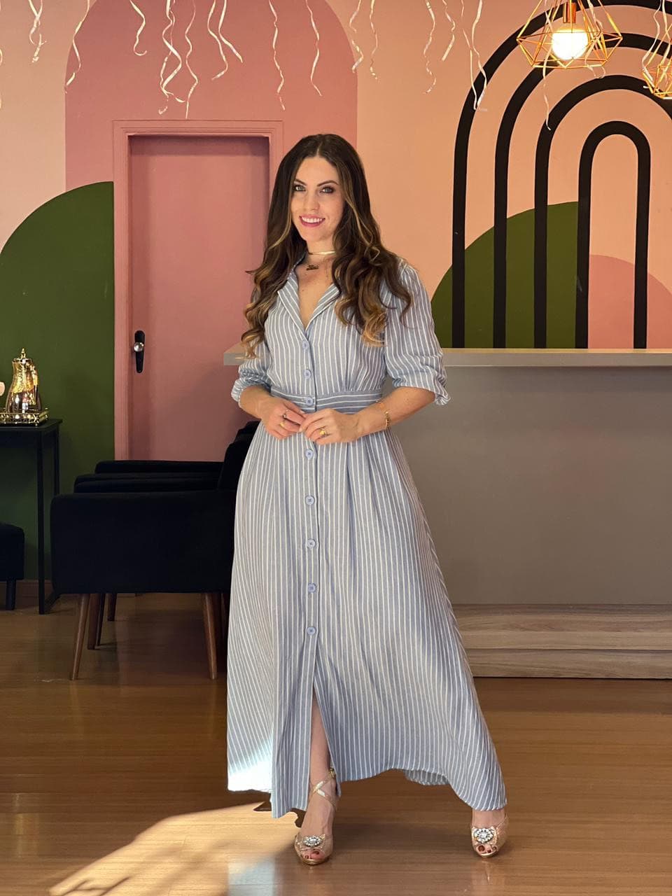 Vestido longo em tecido com aspecto de linho, proporcionando elegância e leveza ao visual. O modelo possui botões frontais funcionais, gola camisa e manga com possibilidade de uso dobrado, trazendo um toque moderno e versátil.Na parte de trás, o detalhe em látex na costa garante melhor ajuste ao corpo, fazendo a peça vestir super bem sem apertar. A modelagem é fluida, confortável e com caimento impecável.