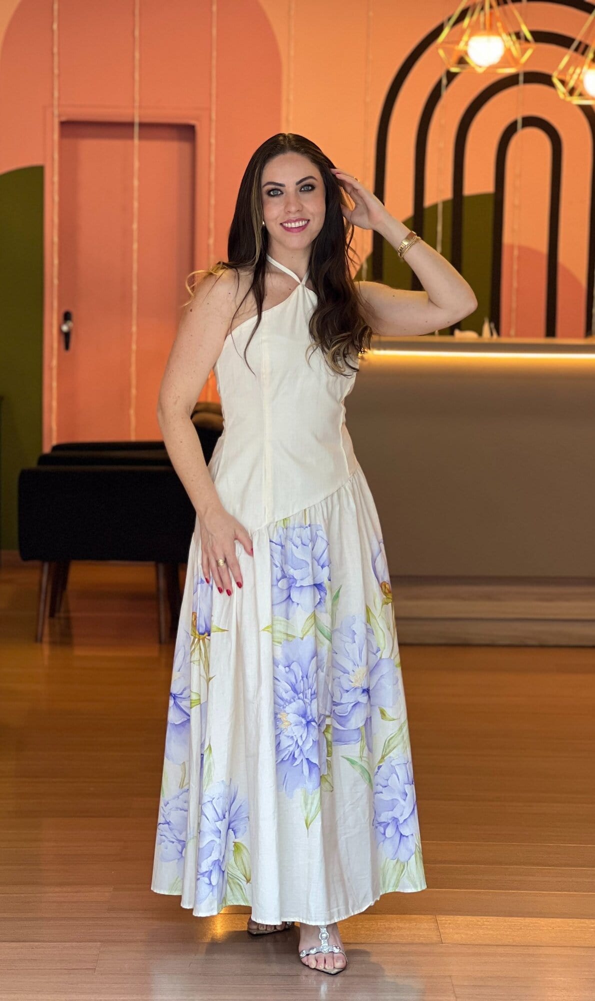 O modelo traz corpo liso off-white e saia com estampa floral em tons suaves de lilás e verde, garantindo um visual delicado e sofisticado. O decote com detalhe cruzado no pescoço valoriza o colo de forma moderna, enquanto a saia fluida acompanha o corpo sem marcar.