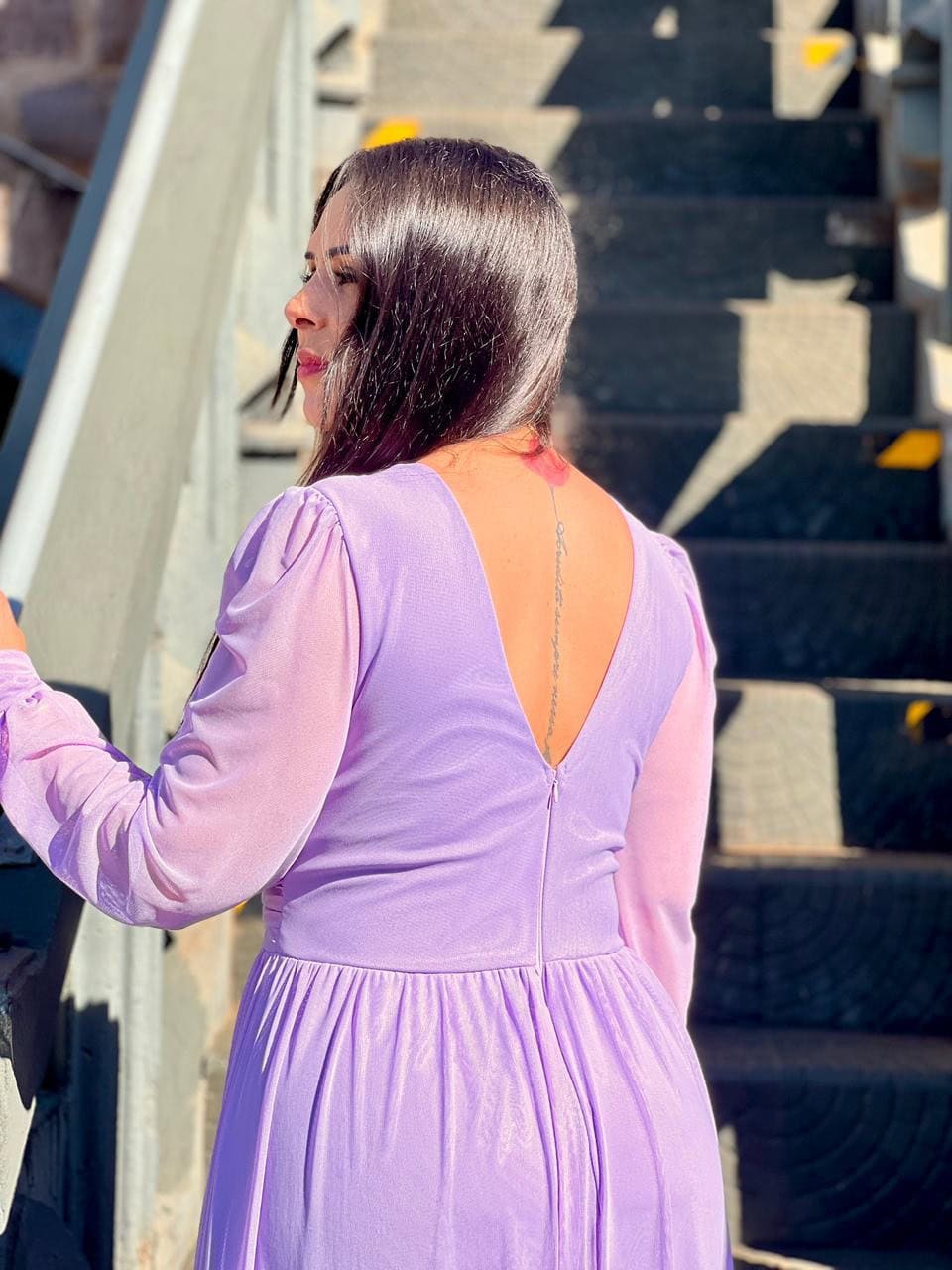 O vestido é confeccionado em um tecido leve e fluido, que proporciona um caimento incrível no corpo, valorizando a silhueta de forma delicada. A cor lavanda é super sofisticada e traz um toque de suavidade e frescor, perfeito para o inverno mais ameno ou para eventos à noite.