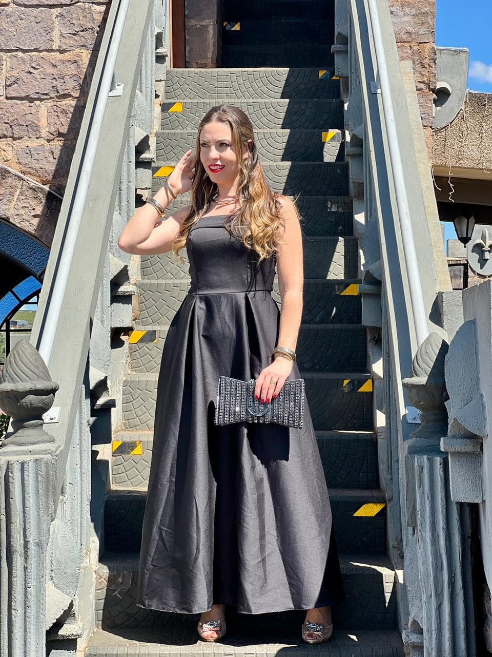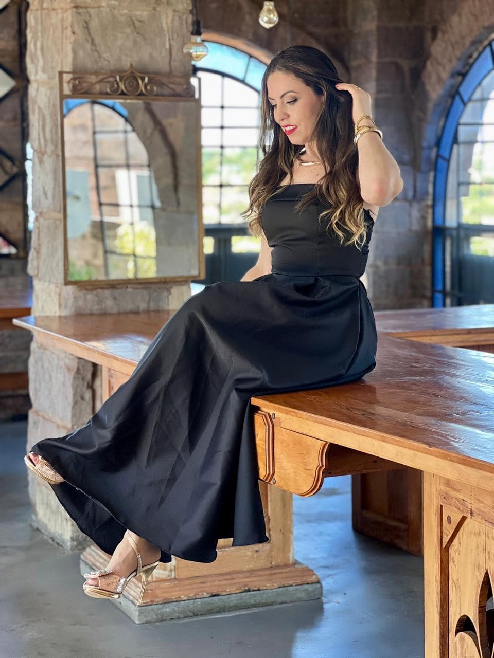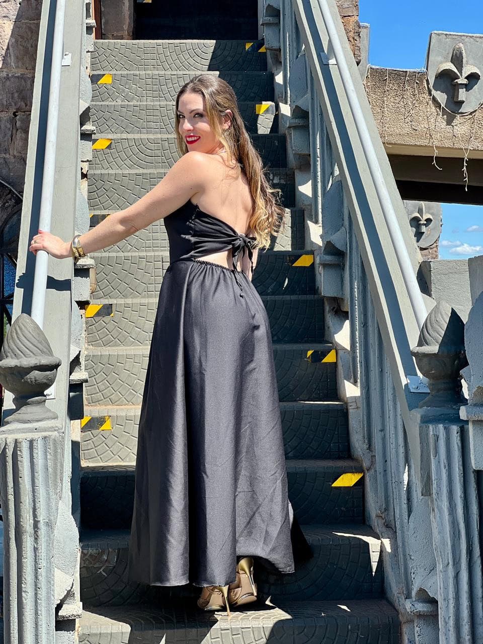 A saia longa com volume sutil cria movimento e presença, enquanto o tecido firme mantém a estrutura do vestido, garantindo um visual refinado e atemporal. É aquela peça que transforma qualquer ocasião — de eventos formais a celebrações especiais.